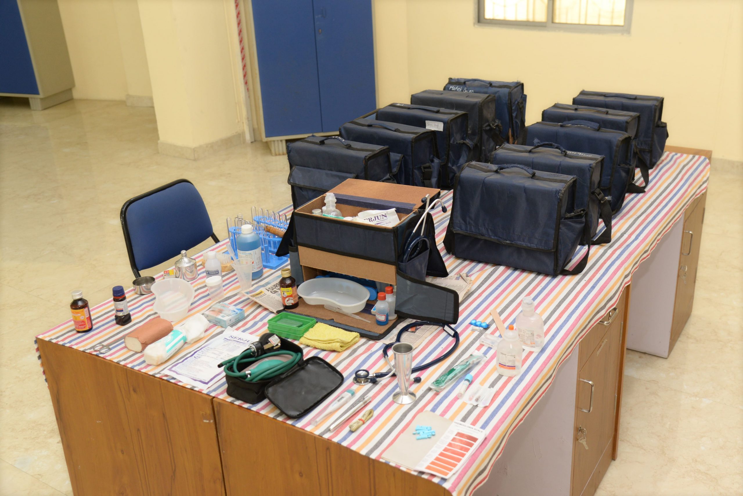 Fully equipped community bags containing essential tools and supplies for home visits and community health interventions.